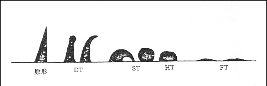 (4)流動(dong)溫度(FT):灰(hui)錐熔化(huà)展開成(chéng)高度在(zài)1.5mm以下的(de)薄層時(shí)的溫度(du)。
